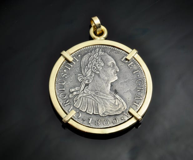 Reproduction belcher chain with a 1734 silver rider ducatoon from the T’Vliegenthart shipwreck (1735) in a hand made 14K bezel. The bench anvil shown dates to 1775. The hammer is from the Holocaust.