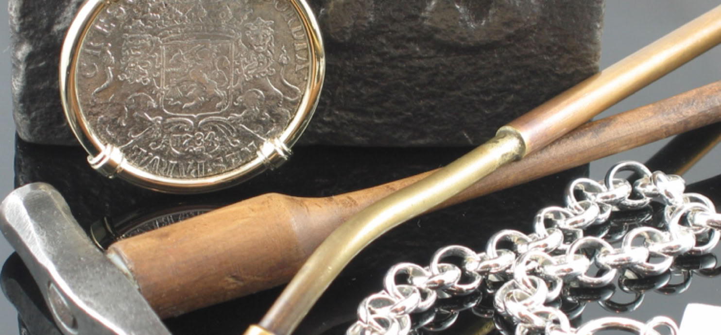 Reproduction belcher chain with a 1734 silver rider ducatoon from the T’Vliegenthart shipwreck (1735) in a hand made 14K bezel. The bench anvil shown dates to 1775. The hammer is from the Holocaust.