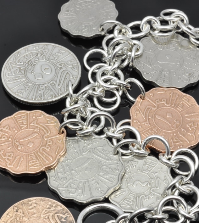 These Bedouin style bracelets are based on research of historic Bedouin metalwork, culture, and jewelry that I began in 2002 while visiting Jerusalem and the Negev. These designs are inspired by the jewelry worn by the women of the semi-nomadic tribes indigenous to the Negev desert region of Israel near Jordan. One marker of this jewelry is the fact that frequently coins did not match within the bracelet and were often mixed with different pieces of metal. In some aspects it is similar to Turkoman (or Turkmen) jewelry seen further east.
